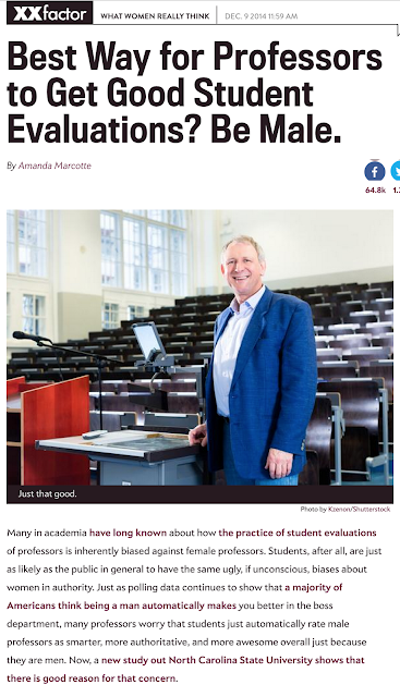 “Students gave professors they thought were male much higher evaluations across the board than they did professors they thought were female, regardless of what gender the professors actually were. When they told students they were men, both the male and female professors got a bump in ratings. When they told the students they were women, they took a hit in ratings.”