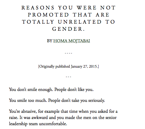 More at www.mcsweeneys.net/articles/reasons-you-were-not-promoted-that-are-totally-unrelated-to-gender